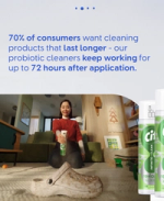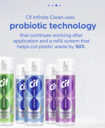 Cif Infinite Clean uses probiotic technology to deliver a deeper, longer-lasting clean. Its probiotics keep working for up to three days after use, and the refillable spray helps cut plastic waste by 50% for a more sustainable clean.